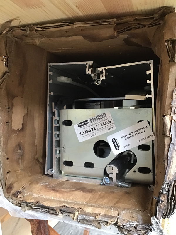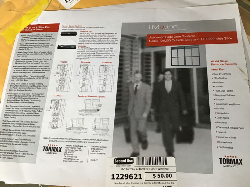New box of what I believe is a Tormax automatic door hardware set. There are no doors included. I think it's just the motorized track mechanism. I don't want to take it too far out of the box in fear of losing parts. If you know what this is and/or how to install it you're going to get a heck of a deal. Just do it soon, so bits don't get lost.