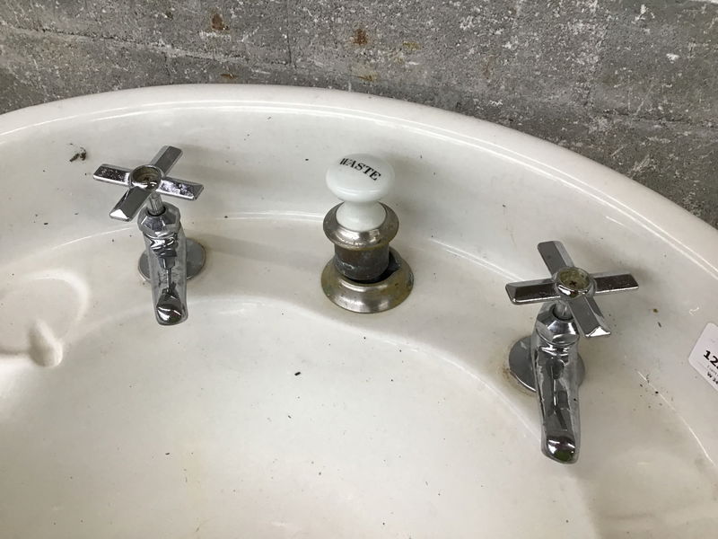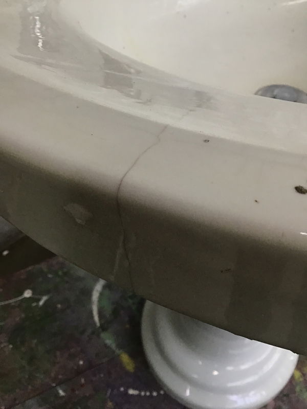 I can't find a makers mark on this antique porcelain pedestal sink, but I feel confident it was made prior to 1930 by the style and drain set up. There is some crackling to the glazing and a couple visible cracks around the front perimeter. They're visible, but not really "feelable." I don't think they'll affect function. It has a smaller than usual drain hole. Underneath the drain has been covered with a coat of clear ?silicone?, which makes me think the drain might not be an easy pull and replace. I'm not taking it apart to find out. Price reflects condition. Has its two brackets to attach sink to the wall. Pedestal looks decent. Height listed includes 3 1/2" tall backsplash. Price reflects condition.