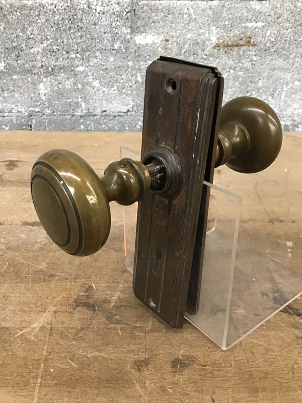 Vintage Art Deco knobset with matching escutcheons, spindle and set screws. Knobs are brass, escutcheons are stamped steel with a brass finish. Cleaned up in house.