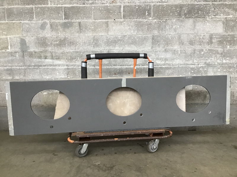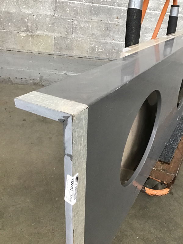 Grey quartz countertop with three 16.75" x 13.75" sink cutouts and a 5" finished front lip. Build yerself a mega vanity or cut it into a few separate vanity tops!