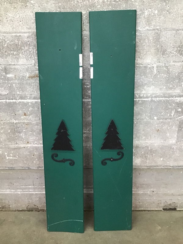 A pair of wooden shutters (no louvers) painted green, each with a black cookie-cutter style evergreen tree on the front.