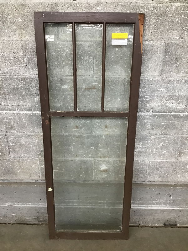 Vintage, four lite, craftsman style wood window sash with wavy glass. Has a chunk missing from the frame, price reflects.