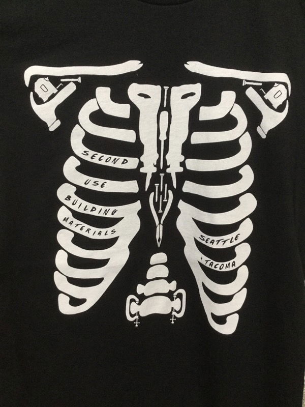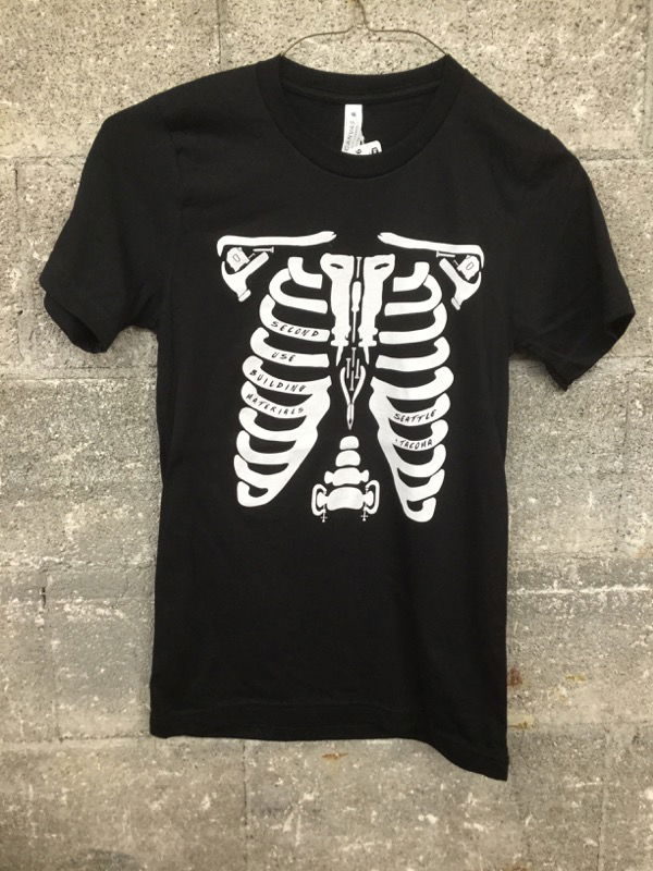 Second Use tool chest (aka skeleton) tee shirt, unisex size S. Our Tool Chest Tee has become a cult favorite and to no one's surprise - this super comfortable, sustainably sourced 100% cotton tee is emblazoned with our favorite tools and doubles as an iconic costume. Seems downright miraculous, doesn't it? Hand screen-printed in Seattle on a ultra-soft black tee.