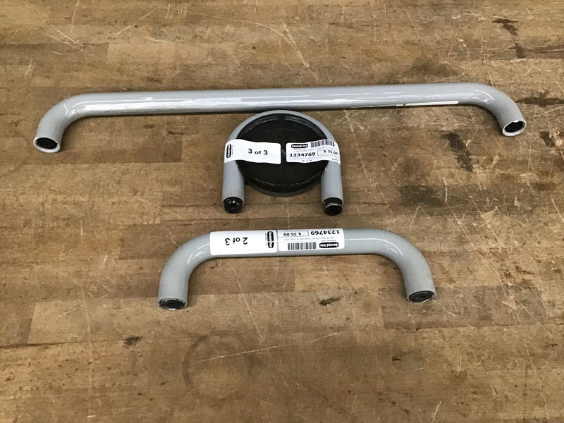 Set of 2 plastic towel bars and a fun soap dish from Hewi Austria in a nice grey color. 1 towel bars are 23.5" long and 1 is 11". Soap dish is 5.5" x 6. They have strange mounting brackets so you might want to get creative. Price reflects.
