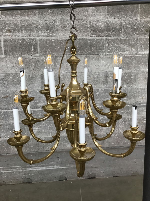 This vintage 12-arm chandelier features solid brass construction, a brilliantly polished finish, and charming details like the floral bobeches. The candelabra sleeves are brittle and damaged and it will need a new canopy and chain, but the wiring looks good and the fixture itself is in excellent condition.