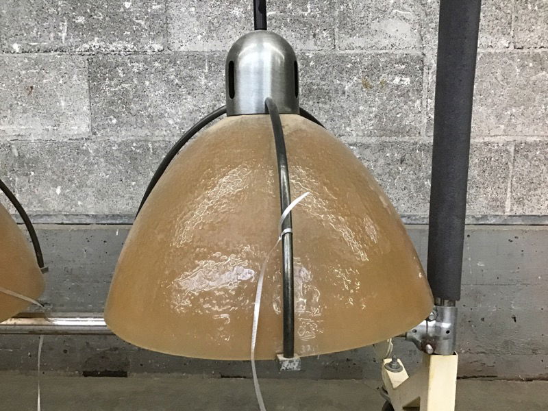 Unique pendant light with an airy, light amber glass shade that has a subtle texture. It's suspended from three spindly steel arms with a 36" cord, giving you a bit of wiggle room to bring the hanging height up or down.
