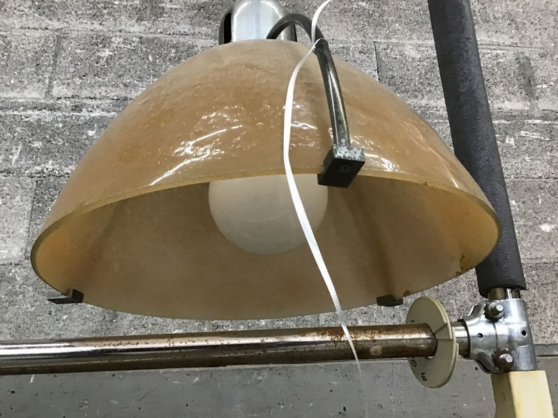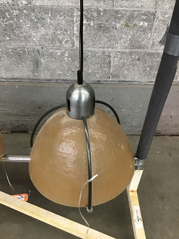 Unique pendant light with an airy, light amber glass shade that has a subtle texture. It's suspended from three spindly steel arms with a 36" cord, giving you a bit of wiggle room to bring the hanging height up or down.