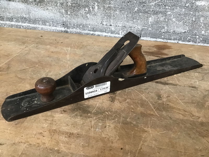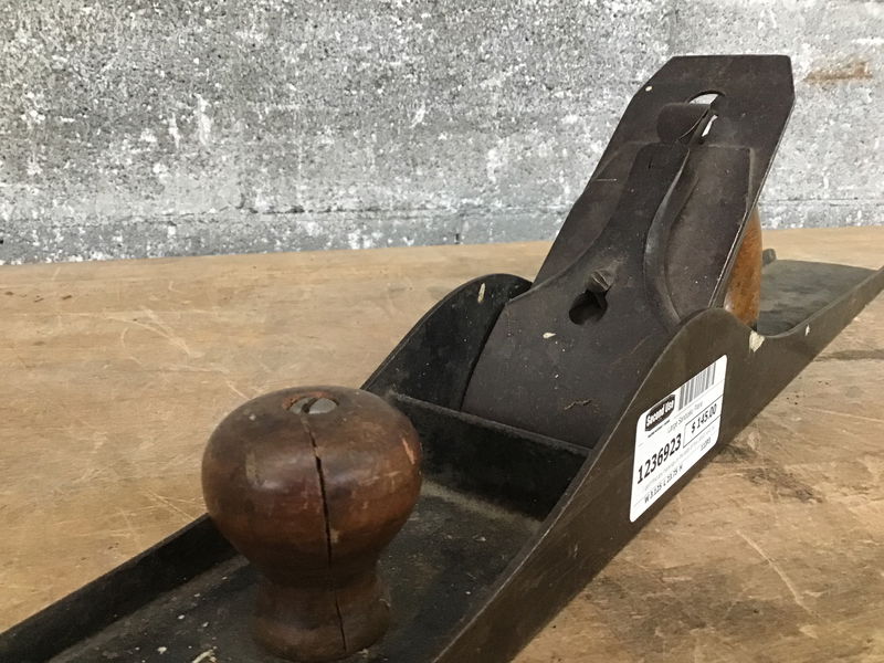 I can't find any markings on the body of this LARGE hand plane, but the blade is marked Sandusky. Sole looks o.k. Seems complete, but the front knob is cracked.