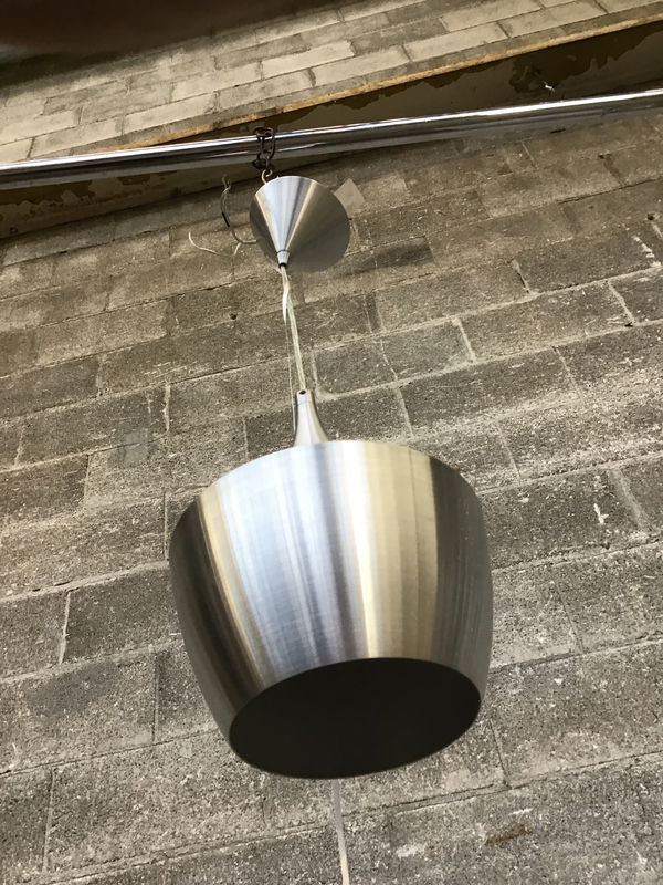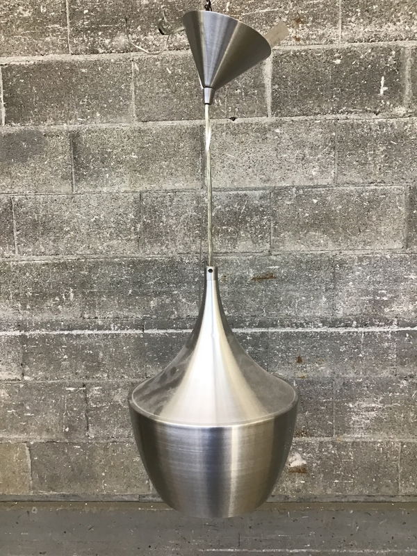 Stylish modern pendant light with a cool shape and brushed chrome finish. A great kitchen table or island light !
