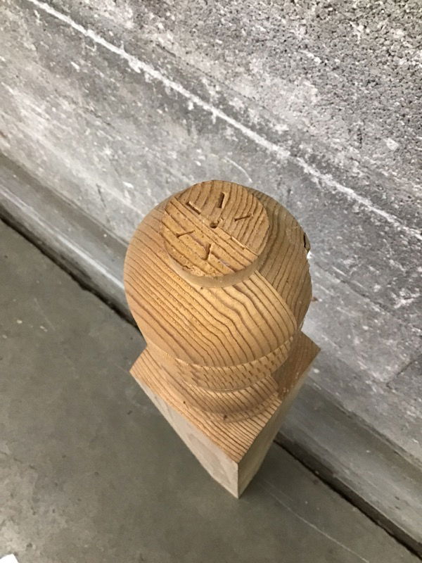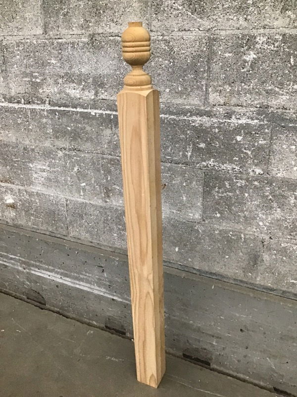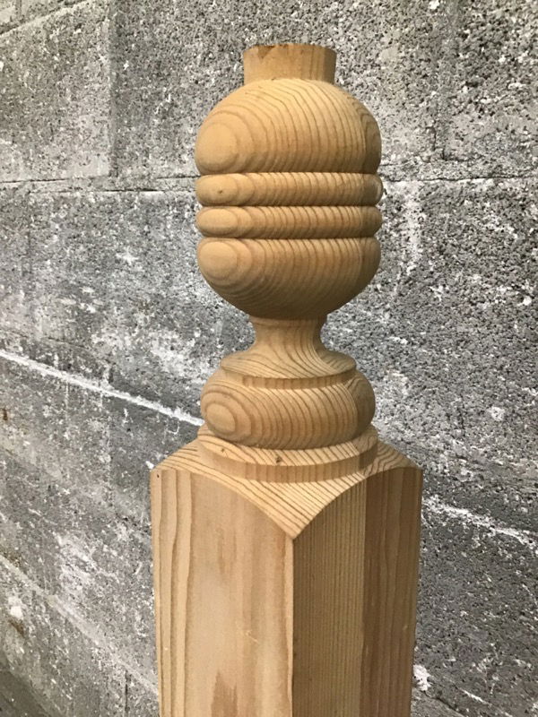 Solid hemlock / fir newel post that has never been installed and may still have its turning nubbin on top. Leans towards a craftsman vibe but with a little extra pizzazz on top. Item may have cosmetic damage, photo may be representational.