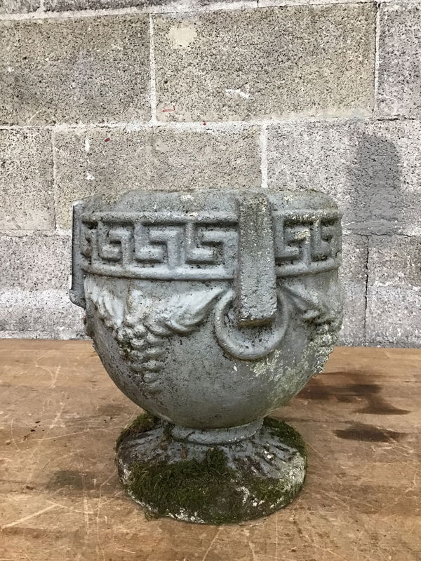 Small cast concrete planter with a Greek key border and grape motif. One side is quite pristine, the other is mossy and weathered in a beautiful way.