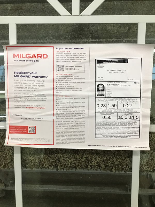 Ca. 2024 Milgard arch top window with faux grids and energy tag attached.