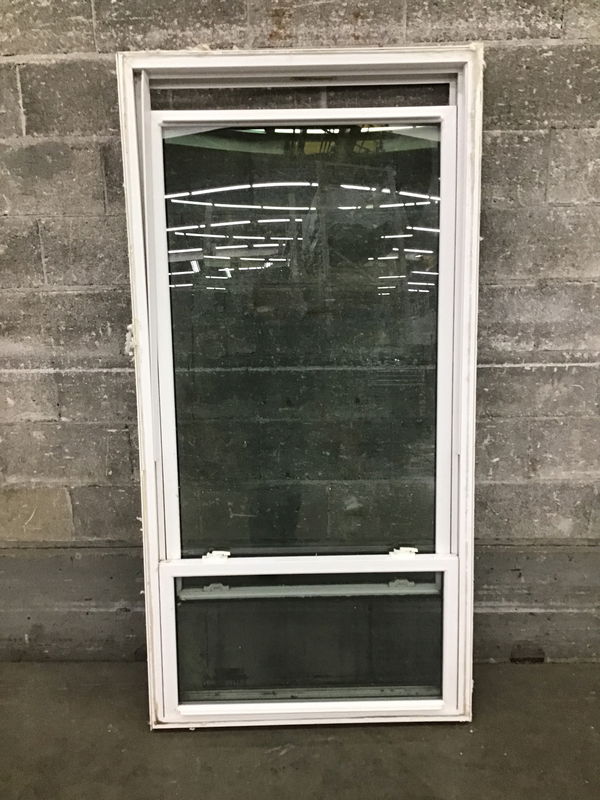 A big ol' double hung vinyl window, most likely from the early 2000s. A little muddied up from sitting in the elements, but undamaged, with thermopane seals in good condition.