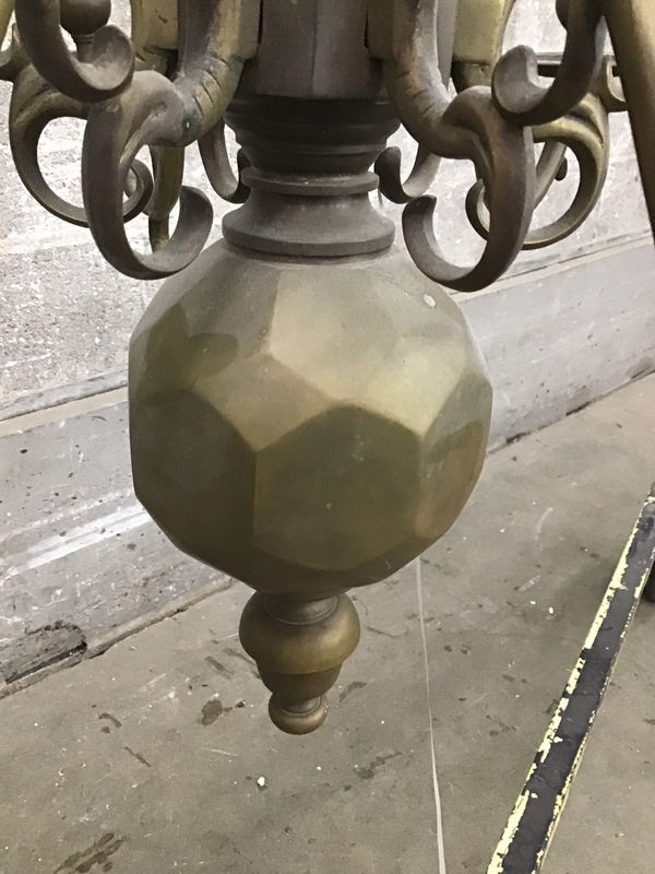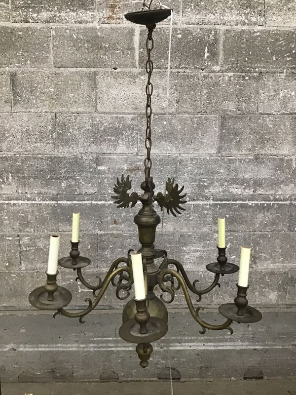 Really funky vintage solid brass 6-arm chandelier with unique geometric shape and 6 feathered wings evoking a humble, many-winged celestial being. Made by Chapman in 1974. One of the wings, which seem to be threaded but were at some point welded on, needs to be re-attached with some JB-Weld or actual soldering (currently has plumbing tape barely holding it in place).