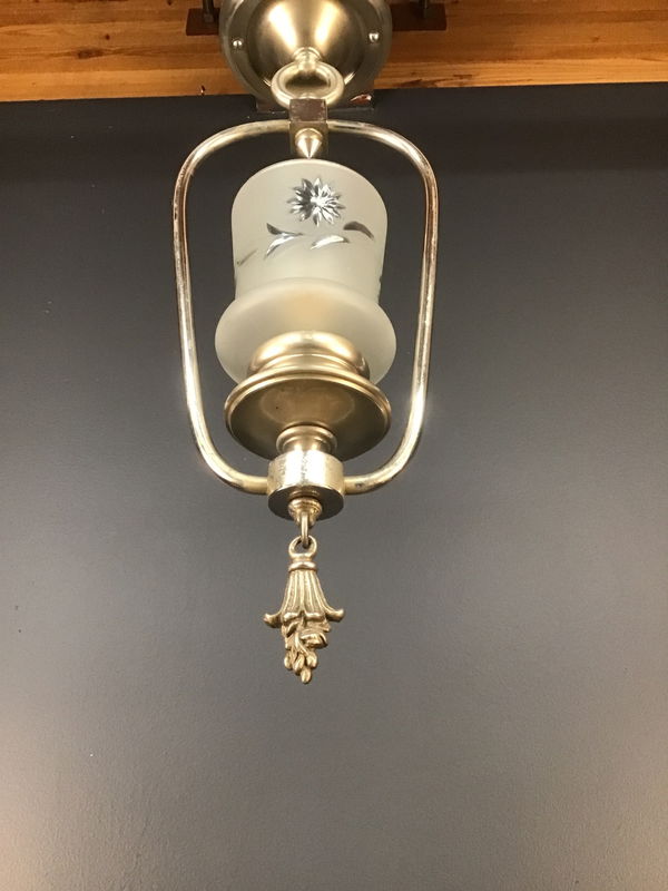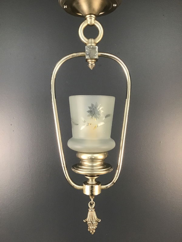 A beautiful hall light from the 1930s in nickel with a frosted shade with a wheel cut flower and leaf design. Restored in our on site light repair workshop