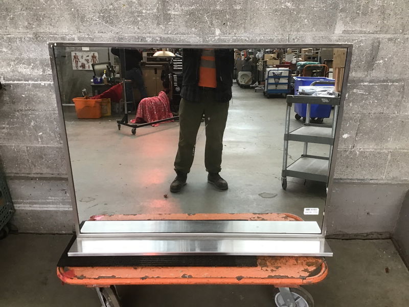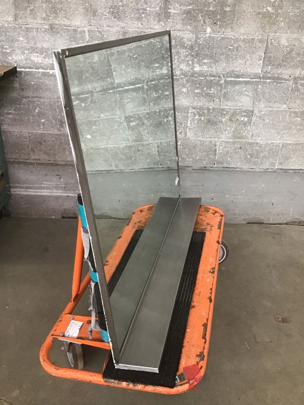 Nice big stainless framed mirror with a little shelf, plus some tastefully etched grafitti in the glass. Includes galvanized mounting bracket. Industrial chic!
