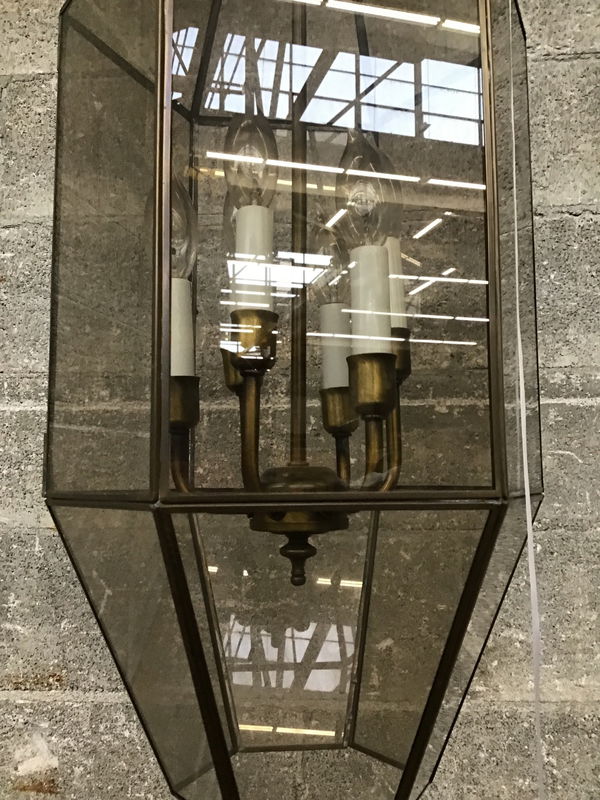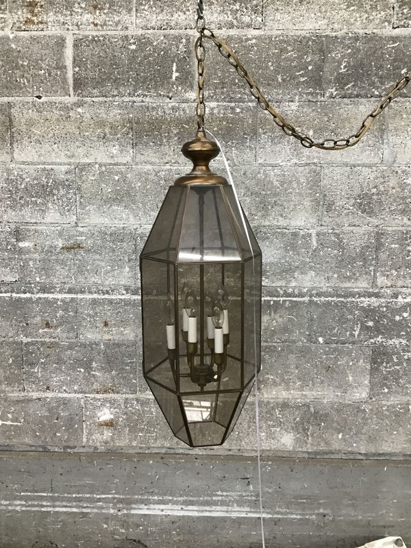 Antique brass finish, hexagon shaped pendant light with about 42" of chain & cord above the approximate dimensions of fixture listed.