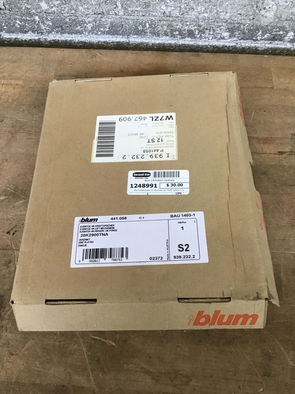 Blum's steel drawer lift mechanism set. Model appears to be 20K2900TNA, for the Aventos system. These have been used and have no cover plate.