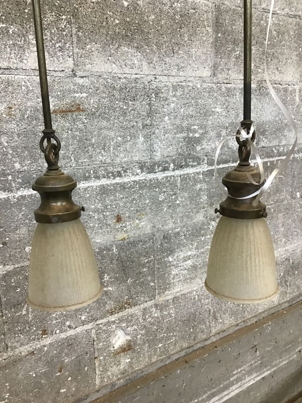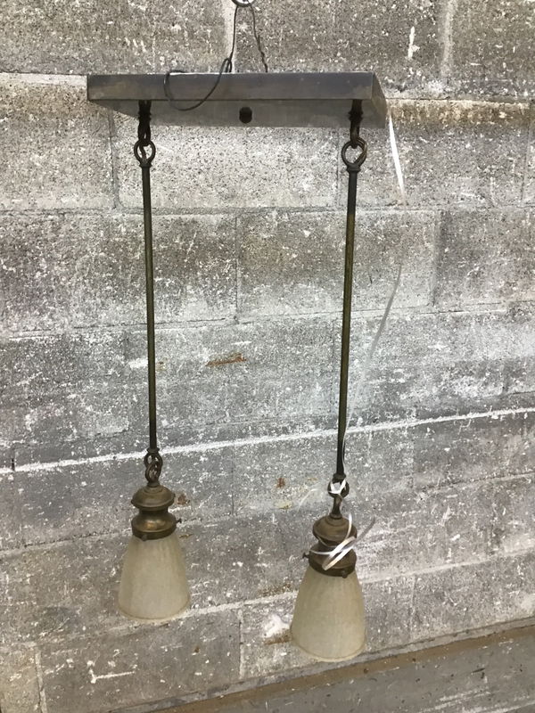 Vintage double pendant in antique brass finish with bell shades. Has a classic 1920s look. Wiring looks decent, but inspect before installation.