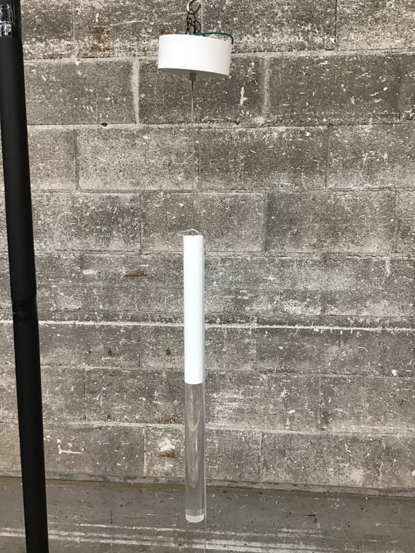 Modern LED pendant light featuring an acrylic and white aluminum cylinder suspended from an understated cable. Dated 2018, suitable for damp locations. Width listed is for the canopy. The fixture itself measures 1-5/8" diameter.