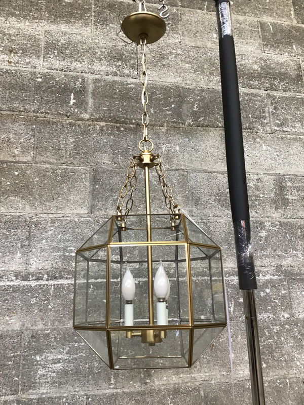 This Morrison ceiling light by Visual Comfort features a geometric lantern with a satin brass finish and clear glass panes suspended from a tapered chain. This is clean as can be and seems to have only been briefly installed prior to coming here. Suitable for damp locations.