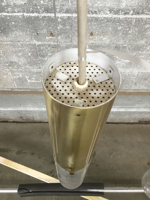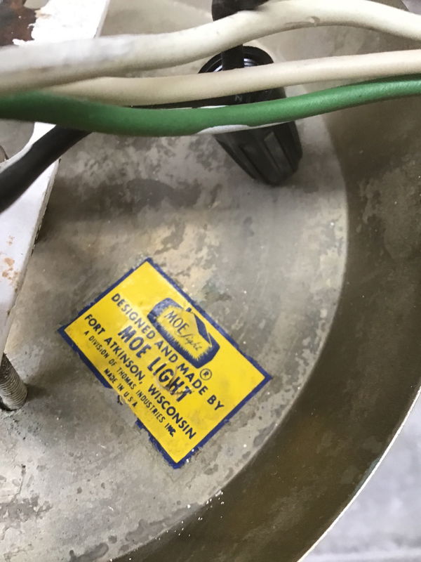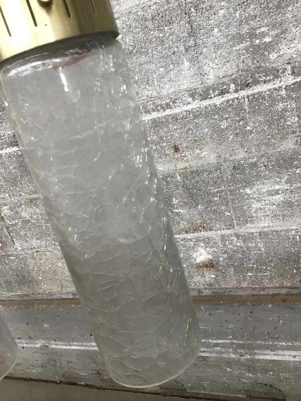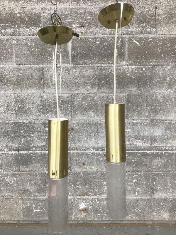 An elegant pair of vintage pendant lights designed by Moe Light of Fort Atkinson, WI. Brass cylinders and obscured glass with a "gator-skin" look. True Mid-Century-Modern pieces with wiring that looks to be in good condition (but if you're curious, feel check out our light shop for re-wiring).