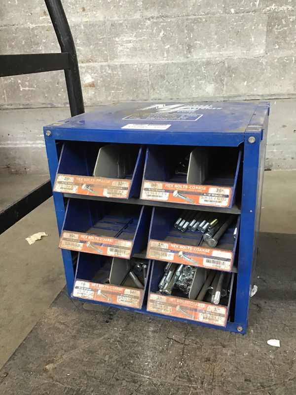 Heavy plastic hardware divider. Two tray dividers with three shelves. Whatever hardware is still in there by the time you get here is all yours babyyyyy!