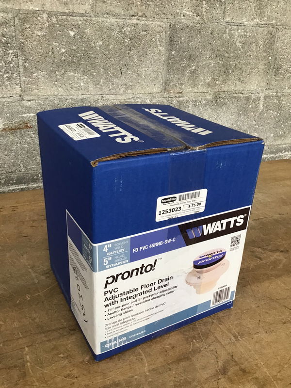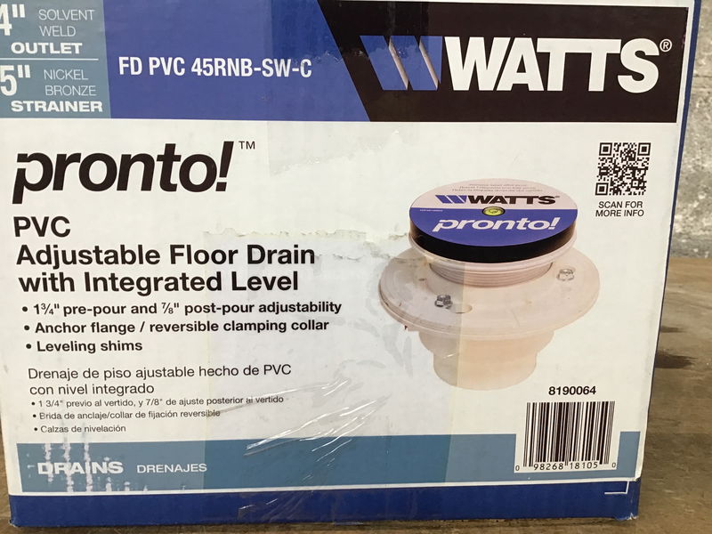 New in the box adjustable PVC floor drain by Watts. Check out full product specs and installation instructions on their website.