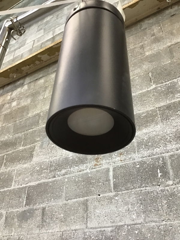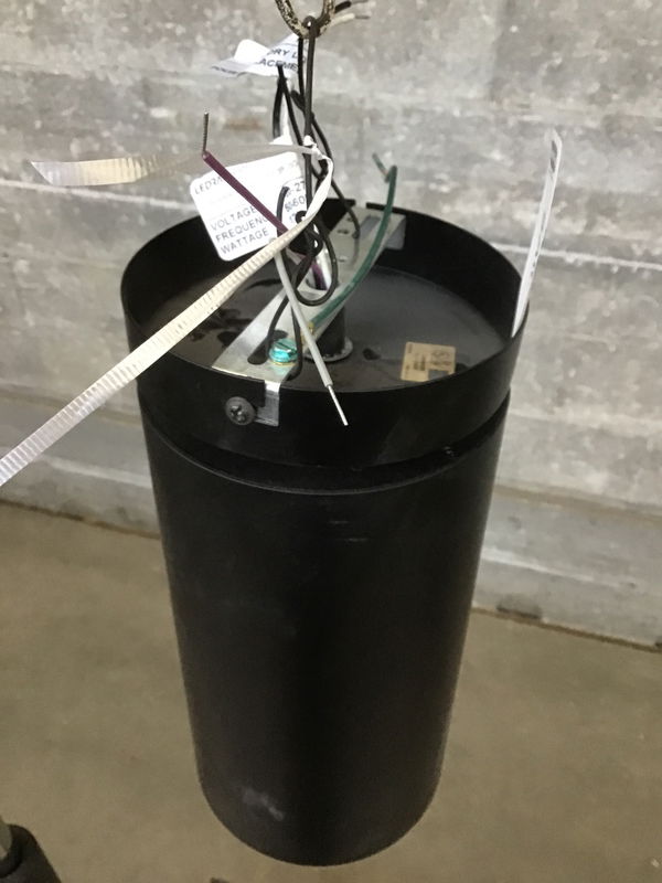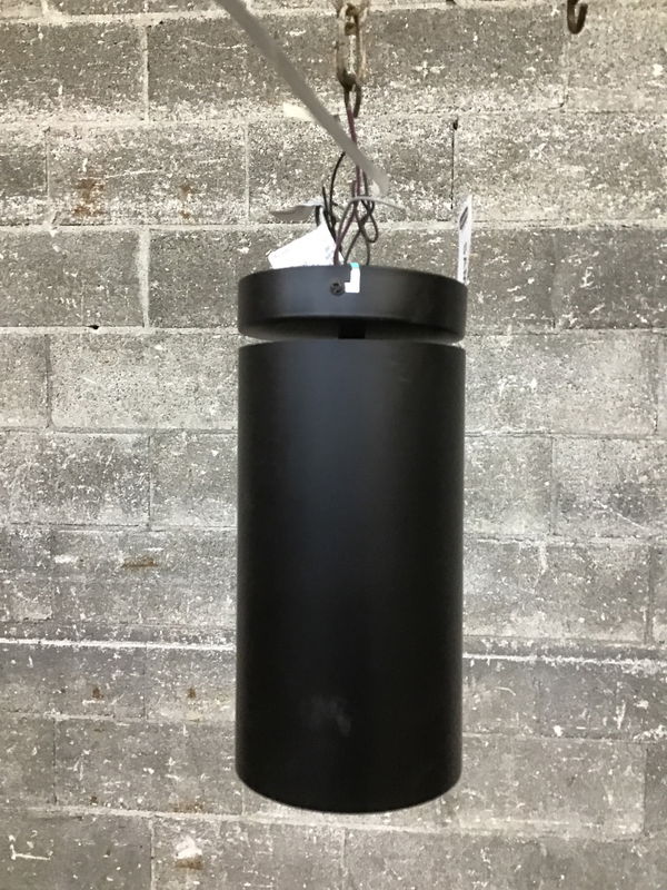 Black, cylindrical LED pendant light that has never been installed. It's suitable for wet locations, so this could work as an indoor or outdoor light. This is a bulk item, no holds please!