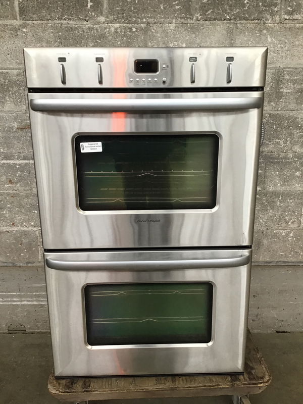 Fisher & Paykel double oven. Blue enameled interior with three trays per bay. Worked when tested in-house, both top and bottom heated simultaneously.