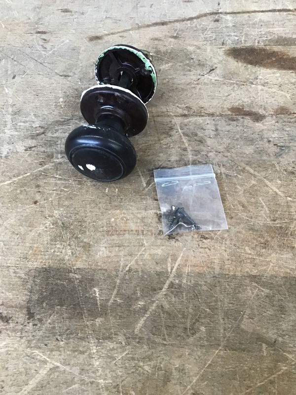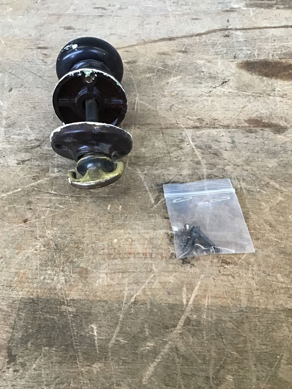 Vintage dark brown bakelite closet knobset with a thumbturn on one side. This comes with spindle, set screws, escutcheons and even screws.