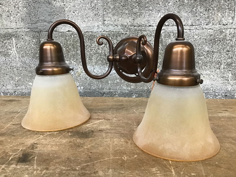 Two arm wall sconce with a warm bronze finish and ombre, bell-shaped shades by Rejuvenation. Suitable for dry locations only.