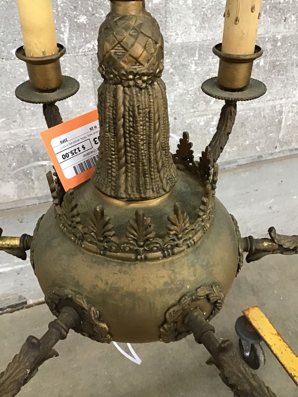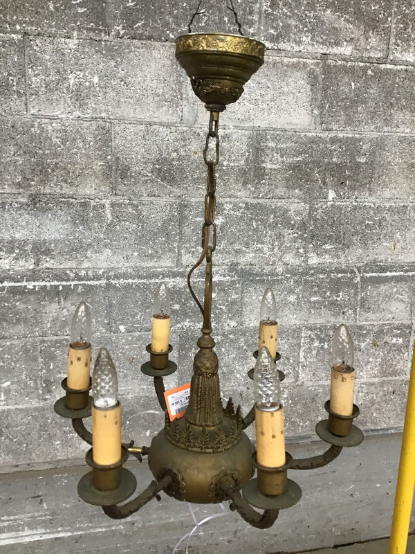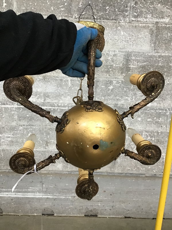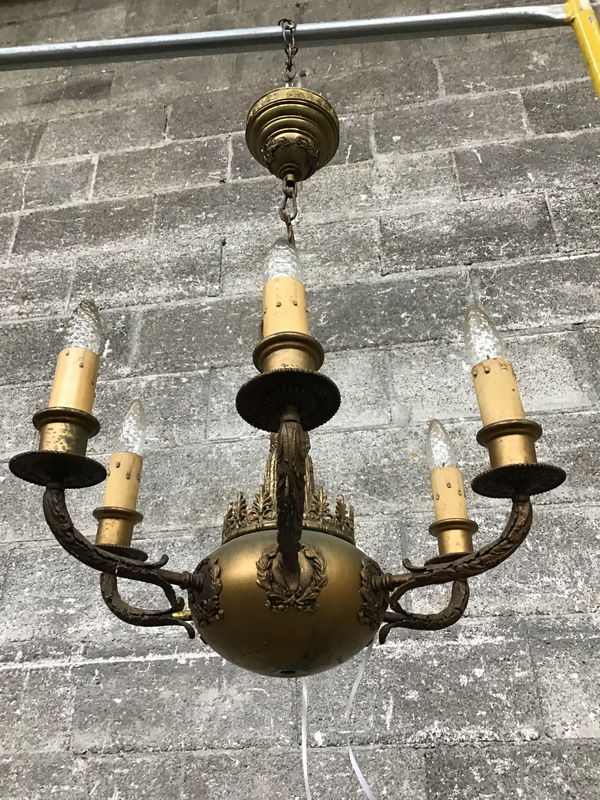 Vintage brass chandelier early 1900s, stylistically in the French Regency direction with ornate floral details. Missing lower cup and finial, needs rewiring, price reflects.