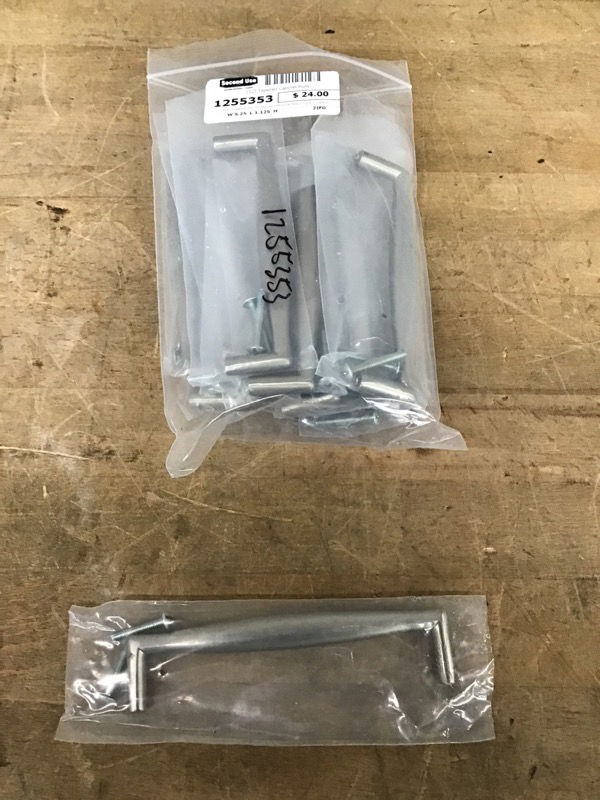 Set of twelve brand new cabinet pulls featuring a brushed nickel finish and a slick design that tapers gently at the edges. Photo may be representational.