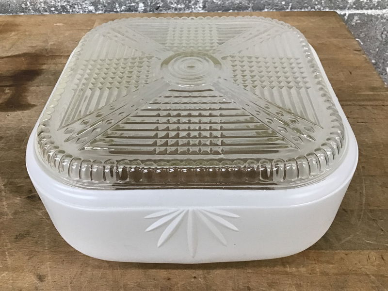 Vintage cake light with rounded corners. Textured glass has a beaded rim and there are raised fan motifs on all four sides of the milk glass base.