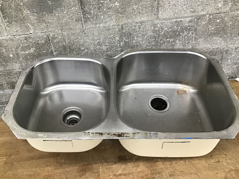 Stainless double wide undermount kitchen sink. It has scratches from everyday use but the brim came out of demo pretty good and isn't all chewed up. I don't see a makers mark but it's made out of a nice thick gauge of stainless.