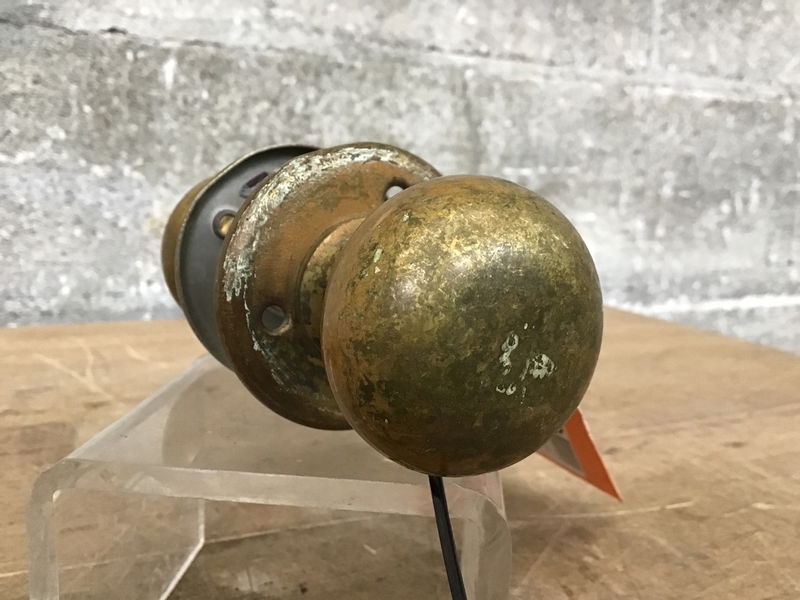 Pair of petite size, smooth solid brass interior door knobs with a pair of simple round escutcheons, their set screws,on a threaded spindle. Mostly free of paint.