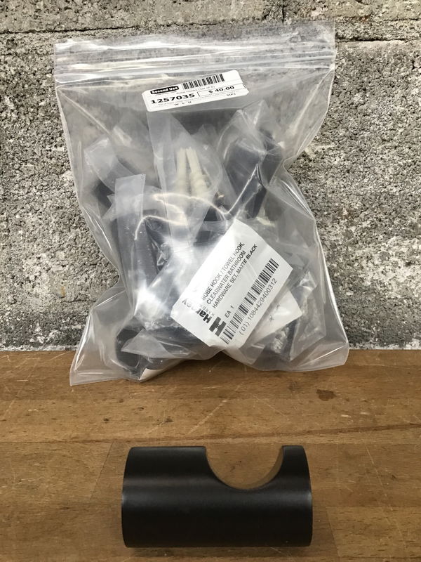 Set of eight contemporary looking black metal robe hooks with mounting hardware. Still in original packaging.