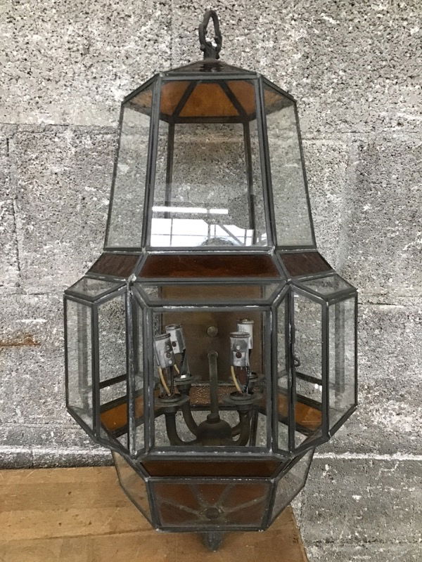 Salvaged from a house built in the 70s, this sconce has the eras distinctive earthy sensibility in the obscured brown glass panels and geometric shape of the body. Has a hinged door/panel that opens to allow for changing bulbs and sleeves. Sculpted finials at the top and bottom.