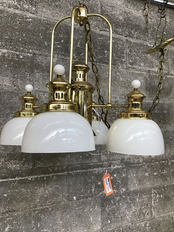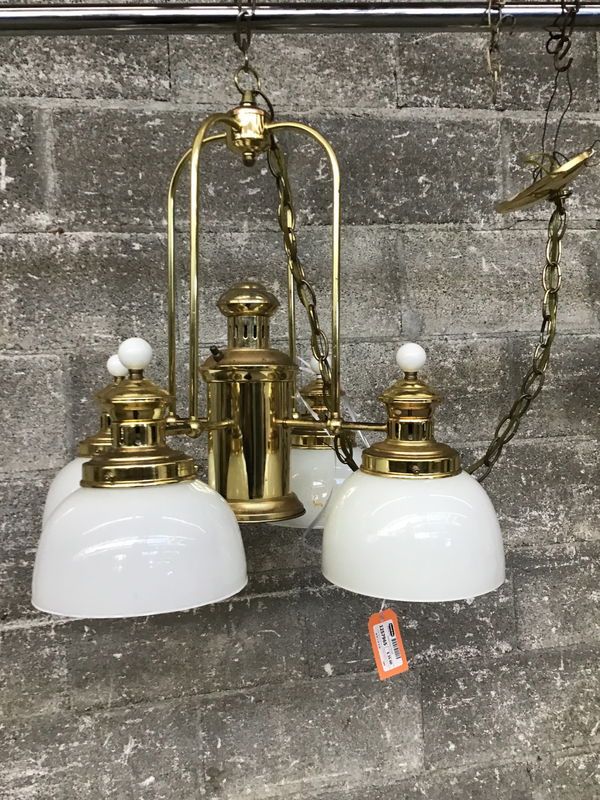 Brass-n-glass pendant fixture in shabby shape, great for a beach cabin.