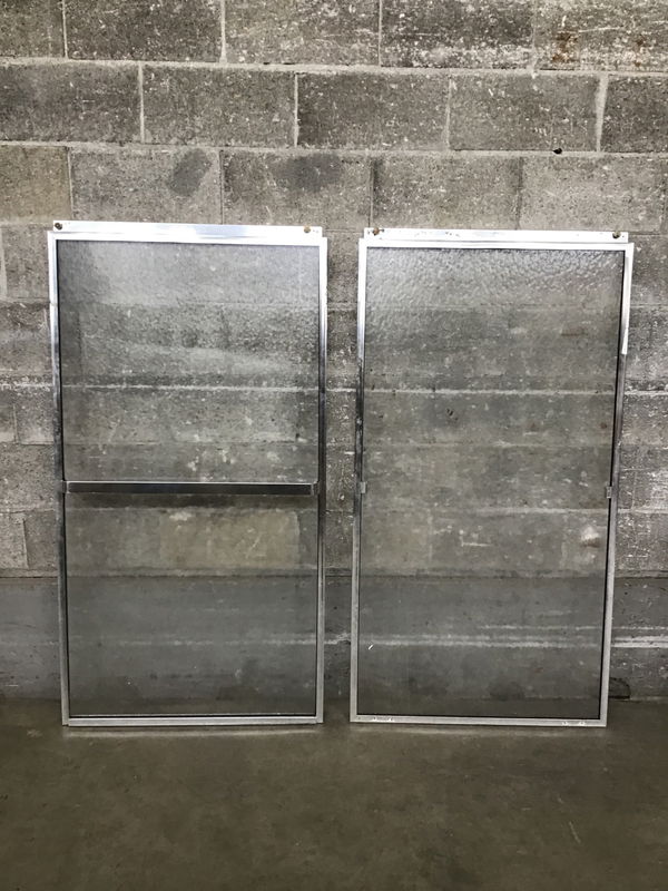 A pair of glass shower doors with obscured glass and a chrome-finish to the frame, with a grab bar on one door.