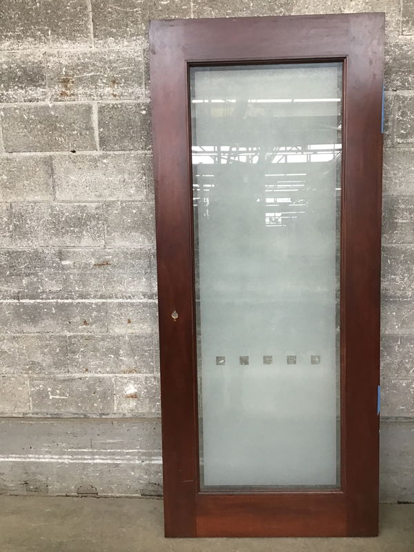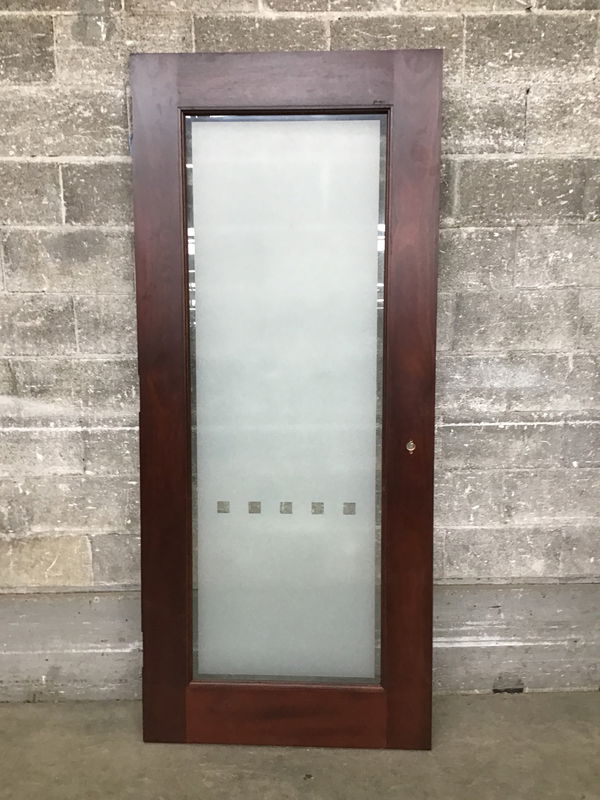 Full lite commercial door with obscured glass film featuring a fun, cube-y design. The face looks like dark stained sapele. Although this is exterior thickness, I would not trust this out in the elements. It would be awesome as a home-to-enclosed-porch door or perhaps one heck of a statement bathroom door. Photo may be representational. Item may have cosmetic damage.
