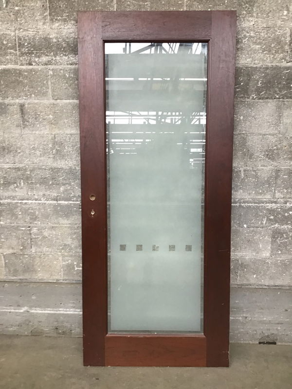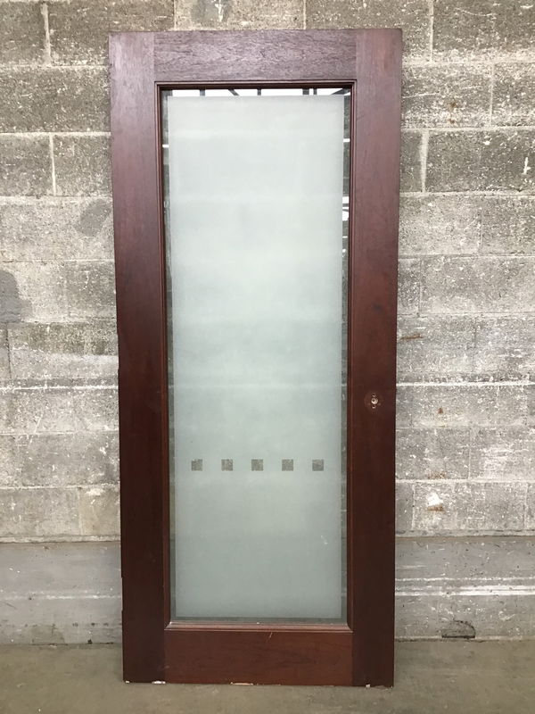 Full lite commercial door with obscured glass film featuring a fun, cube-y design. The face looks like dark stained sapele. Although this is exterior thickness, I would not trust this out in the elements. It would be awesome as a home-to-enclosed-porch door or perhaps one heck of a statement bathroom door. Photo may be representational. Item may have cosmetic damage.