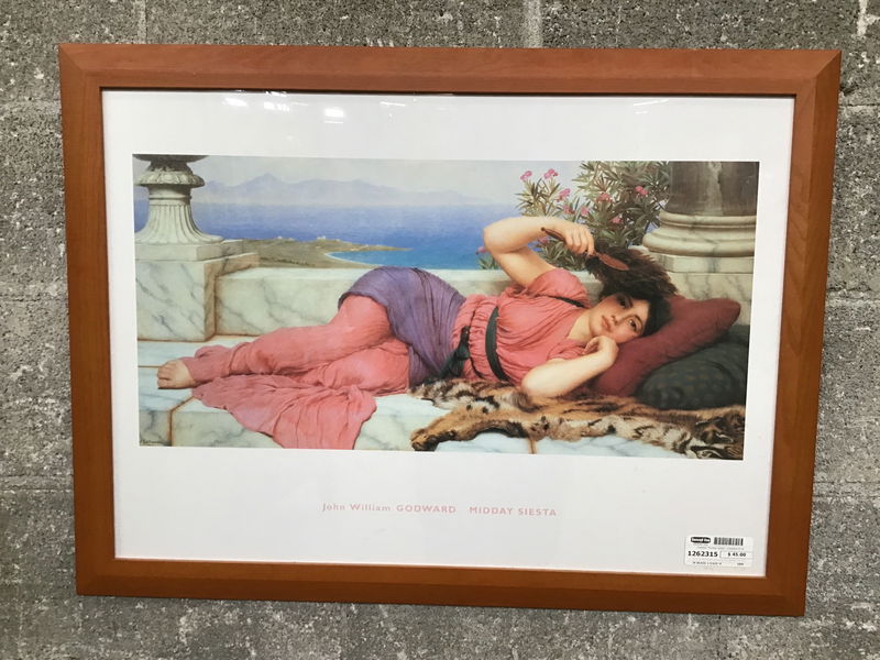 A print of John William Godward's 1910 painting. Fun fact, this piece is mislabelled, as Godward actually titled the piece "Noon Day Rest," and not "Midday Siesta" as the print purports.