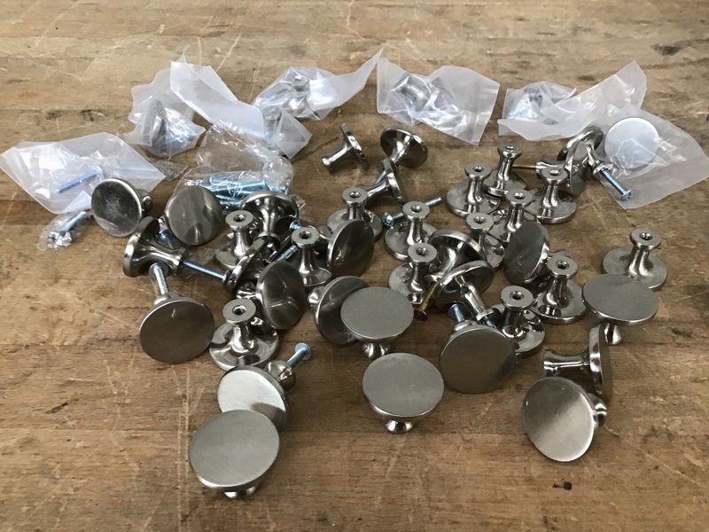 Forty six nickel finish cabinet knobs. A few are still in their packages, but most are out of bag. There are quite few machine screws, but I think you'll need a few more.