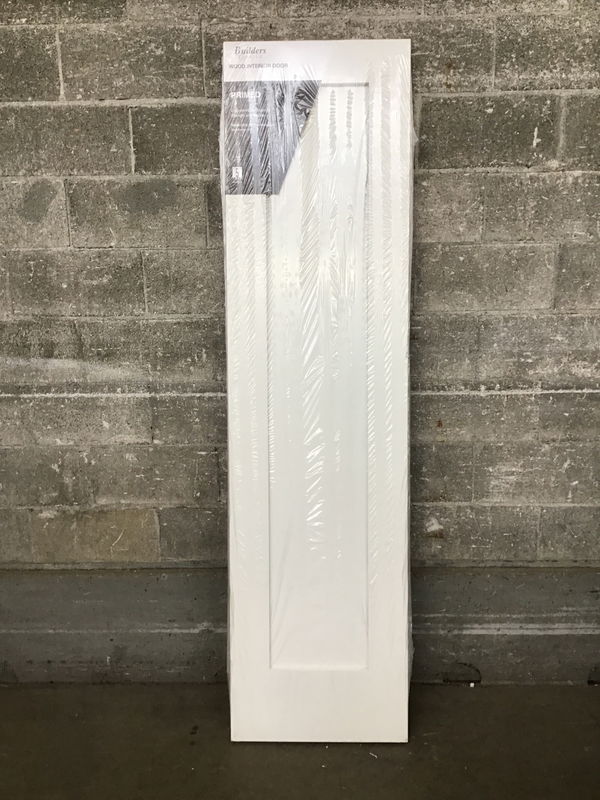 New in wrapping single panel shaker-style interior french door from Builder's Choice. Panel is glass, but is covered by plastic and primer.