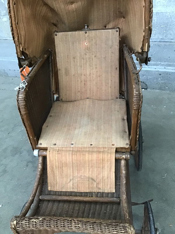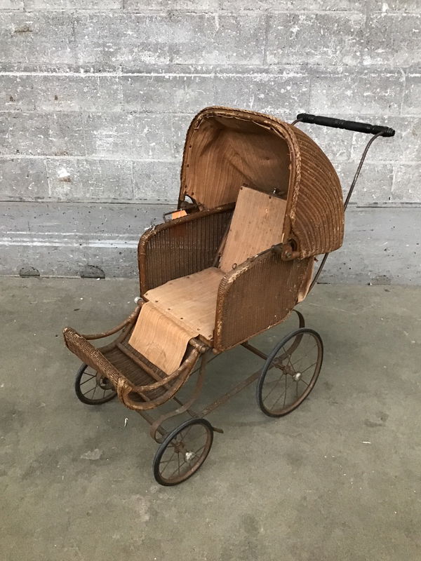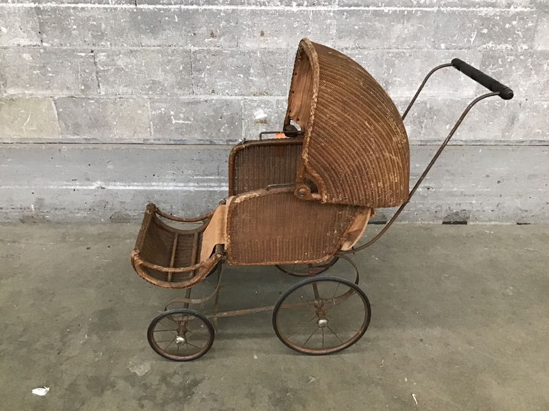 This antique wicker baby buggy stroller came to us fresh off the set of a horror movie where it may have been used as a prop. I personally cannot contest to it being haunted so you'll have to take it home and find out for yourself. The top articulates to keep the sun out of little Damien's eyes and the backrest lowers so he can take a little nap. Overall it's in great shape; dirty from age, but everything functions, the metal frame has a lot of spring left, and the wicker itself is in great shape