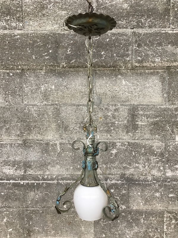 A pretty Neoclassical strap pendant light from the 1920s. The original polychrome paint shows wear from it's age, but who doesn't, really? Reflected in price. Rewired in our on site lighting repair workshop.