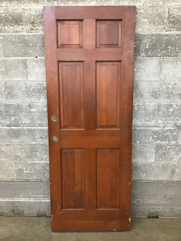 Stained fir, raised six panel door that has been double bored. Price reflects.