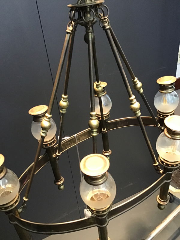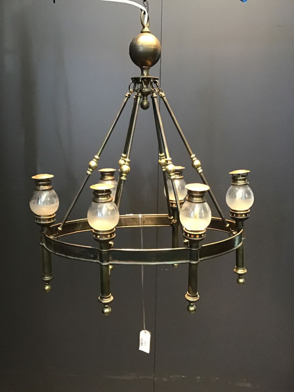 Simply beautiful brass vintage chandelier made by Chapman Manufacturing Company. Chapman have been making unique and stunning lighting for decades and have had lighting fixtures in many prestigious institutions. This chandelier features six lights with brass caps and lovely glass globes protecting the bulb. Brass arms attach from the inner base to connect to the central brass ball. Not sure of the exact age but is vintage with a nice patina and lights up just swimmingly. Retails for about $3000 normally, so light up your life with this absolute beauty that would enhance any space.